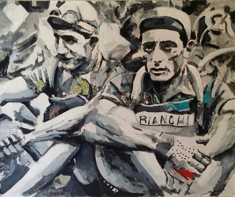 En ancien coureur professionnel, ses peintures reflètent ce monde très particulier qu'il connaît parfaitement. De sa vie consacrée au vélo et à la route, années qu'il qualifie lui même de magiques, il a appris et retenu trois mots clés : "persévérance, travail et effort" ! Et c'est fidèle à cette philosophie, qui lui a permis de toujours aller de l'avant, qu'il a abordé son nouvel art.