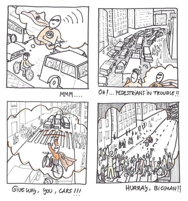 Au travers de ses dessins et ses bandes dessinées en épisode, il nous présente sous la forme d'anecdote une ville libérée des voitures, laissant la part belle aux piétons et aux cyclistes, seuls capables d'humaniser les grandes cités !
